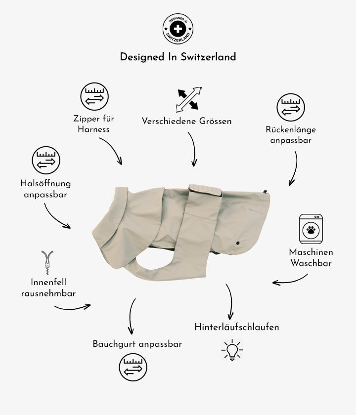 Swiss design meets intelligent function Each PET & Co. coat is designed in Switzerland with great attention to detail – offering a perfect blend of elegance, protection, and everyday practicality. The quilted outer fabric is water-repellent and windproof, while the soft inner lining keeps your dog comfortably warm. All coats are made with 10,000 mm waterproof performance material. Fine stitching, tonal edging, and minimal branding create a timeless look – perfect for both city walks andoutdoor adventures. The thoughtful design combines functionality and style – and pairs beautifully with PET & Co. travel and accessory collections.